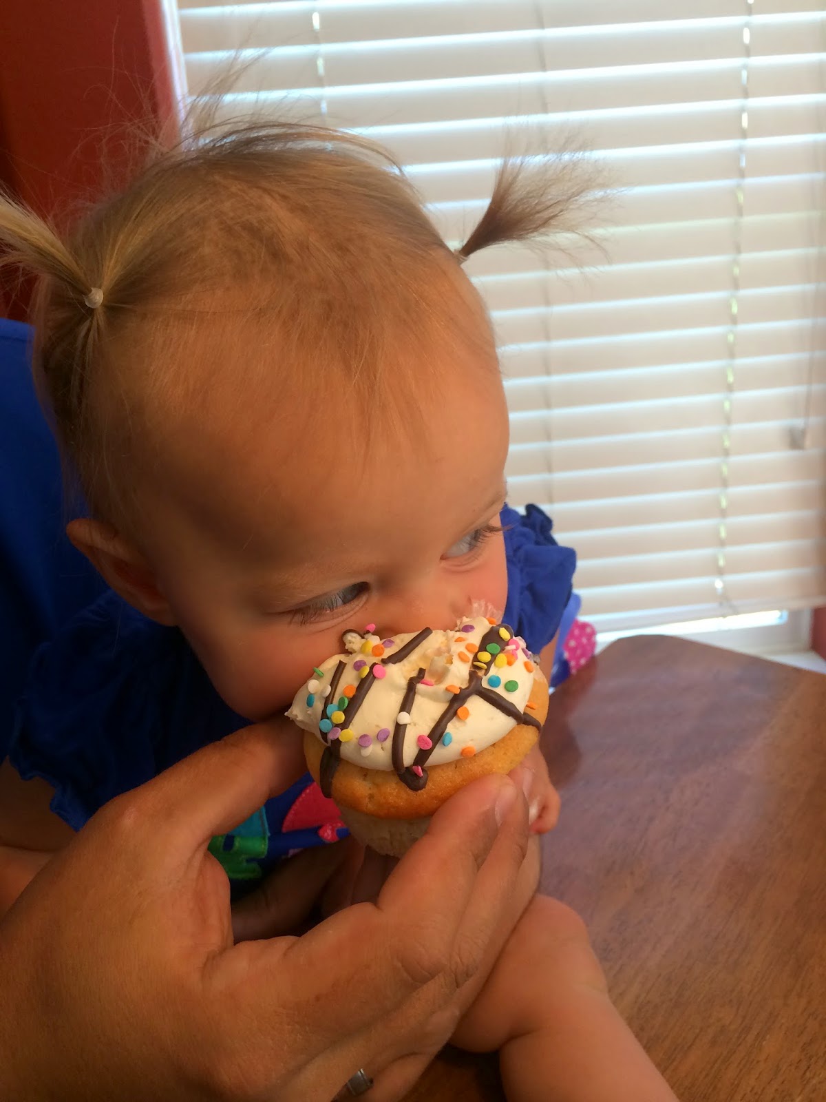 After my parents left I took the kids down to the cupcake shop Frosted and had them pick out a birthday cupcake for Colbi, they picked the banana split flavor and when Dave came home for lunch we put a candle in it, sang her Happy Birthday (which she loved and just smiled at us the entire time we sang) and then we let her go to town on the cupcake. Even though we had celebrated a couple times before this was the first time I let her actually eat the cake. Dave started by feeding her and then once she got the idea she loved it and could not get enough. It was so fun watching her eat it and the boys were loving it as well. Dave made the comment "this is how all 1 year old birthday parties should be". We didn't have a big celebration but that did not make the day any less special, it was fun to just be together as our family of 6 and celebrate this sweet little girl who has been a huge bright spot in our lives this last year.